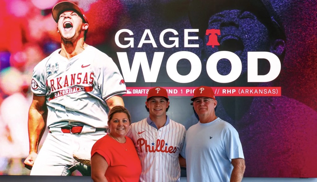 1 – Gage Wood – Pitcher – Arkansas – $3,000,000 (underslot by $492,200): The guy who threw the 19K no-hitter in the World Series. His fastball is a weapon.